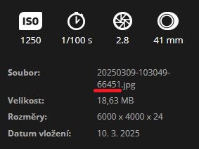 Po kliknutí na ( i ) u fotografie na Zoneramě se otevře okno s informacemi o fotografii, včetně názvu souboru.